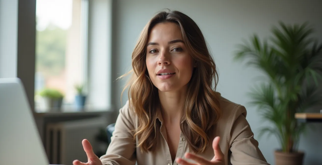 L’espace de tournage idéal conjugue simplicité et lumière naturelle. Un coin de bureau dégagé, un mur uni, une plante verte pour adoucir la composition : ces éléments minimalistes créent un environnement professionnel sans artifice. La lumière latérale provenant d’une fenêtre modèle les volumes et évite l’aspect plat d’un éclairage frontal direct.